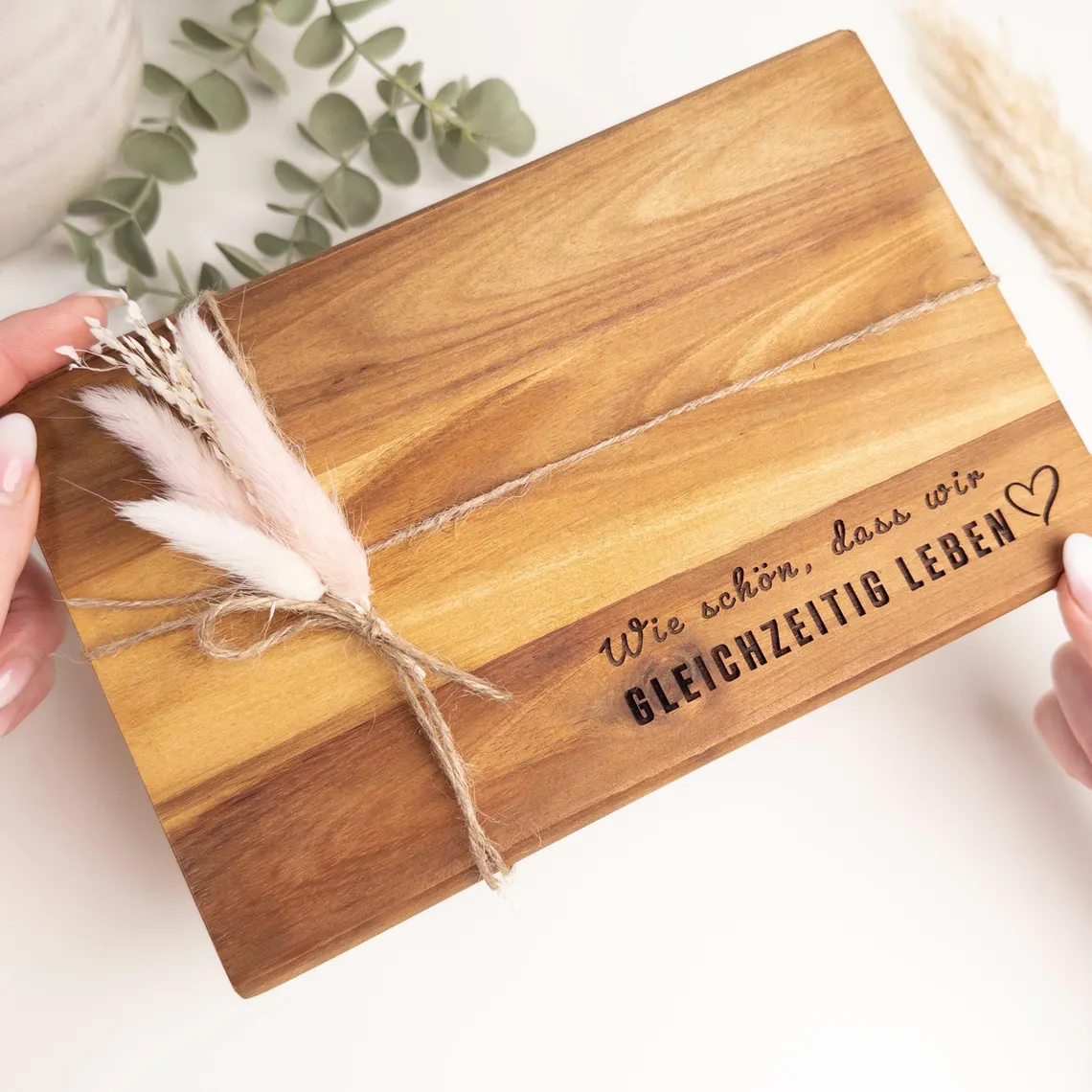 Dieses kleine Holzbrett aus FSC-zertifiziertem Akazienholz wird durch die Gravur „Wie schön, dass wir gleichzeitig leben“ zu einem persönlichen Highlight. Mit den Maßen 23 × 15 × 1 cm (BxHxT) eignet es sich besonders gut als liebevolles Geburtstagsgeschenk – wahlweise mit oder ohne Aufsteller erhältlich.
